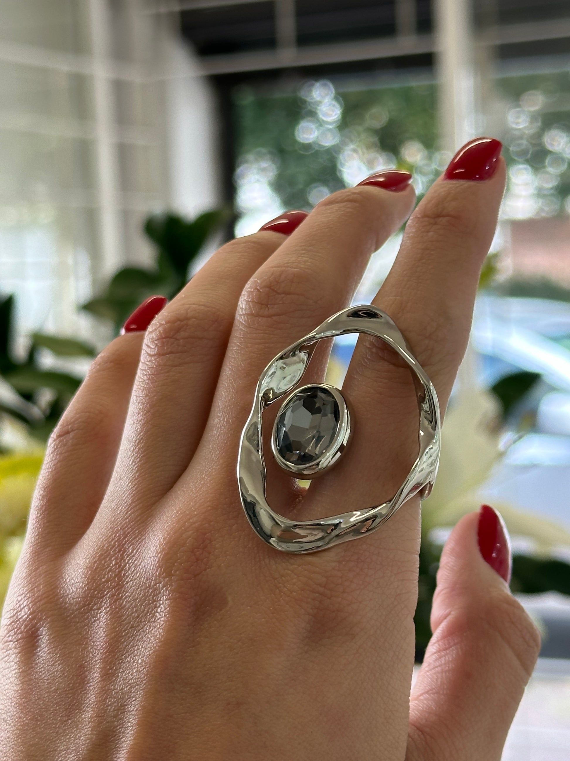 Anillo llamativo ajustable en forma de circulo con piedra gris en la parte de en medio, dandole un toque bastante chic y glam. una pieza que no te puedes perder.