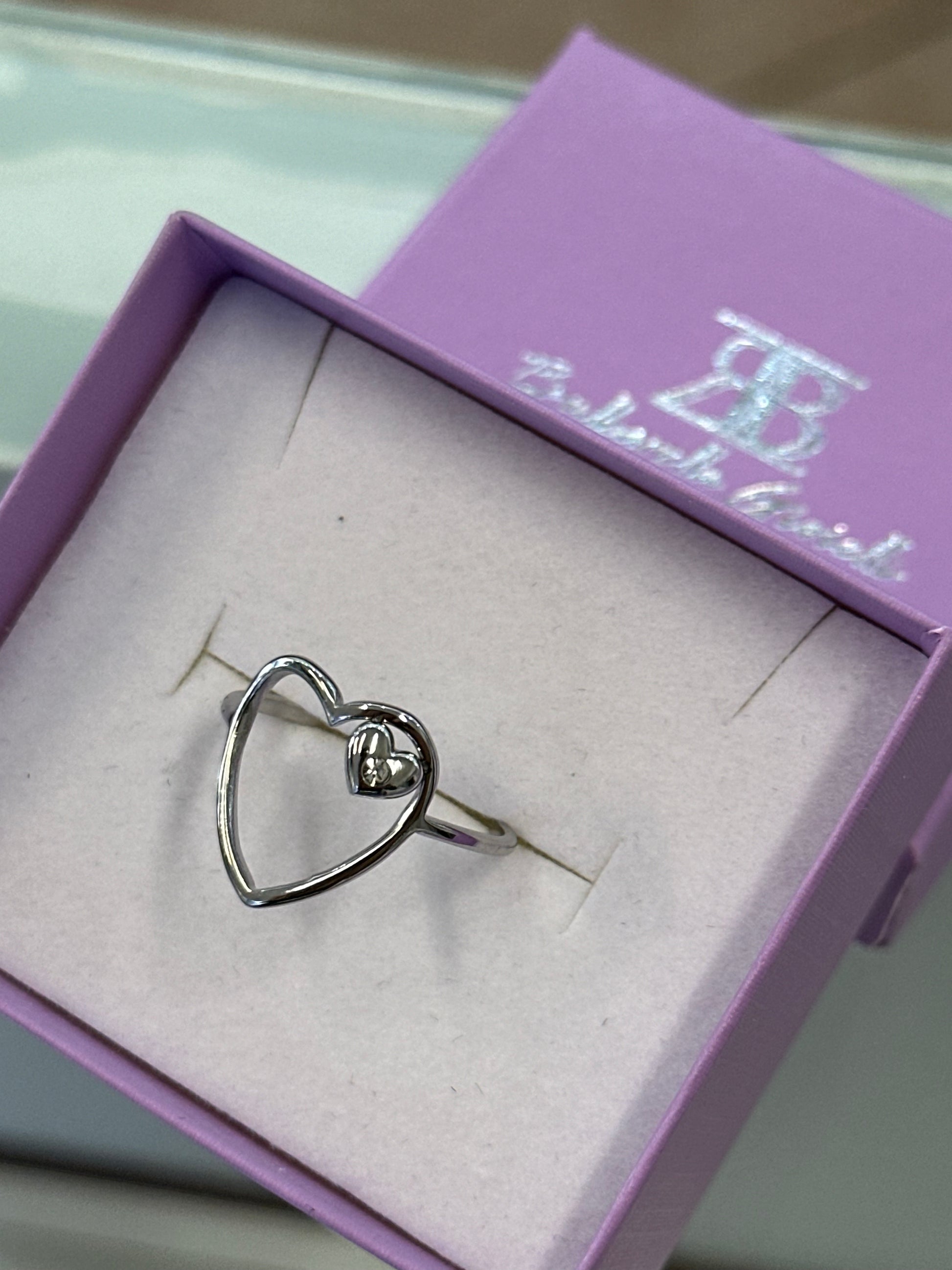 Anillo plateado ajustable de acero inoxidable resistente al agua con forma de silueta de corazón y una piedrita pequeña.
