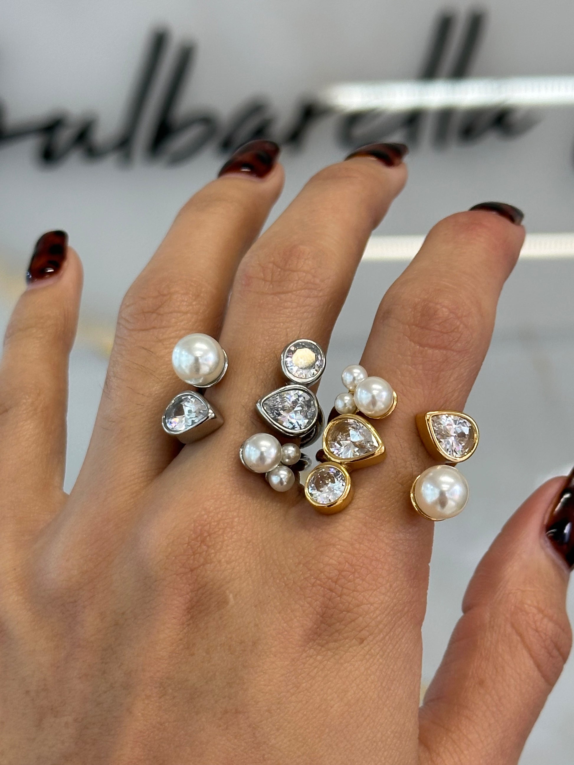 Anillo ajustable aplicación perlas y cristales, base de acero inoxidable resistente al agua.
