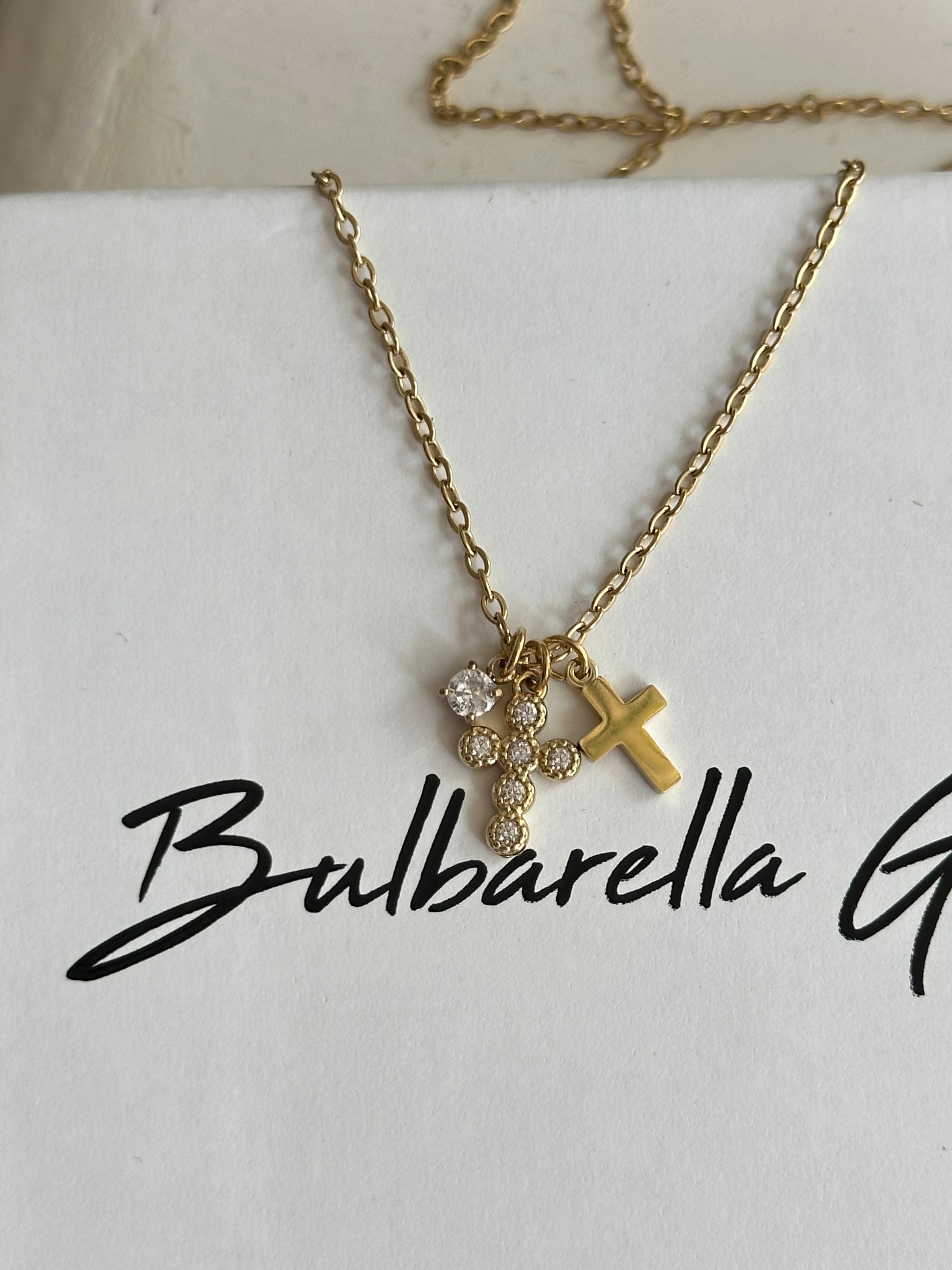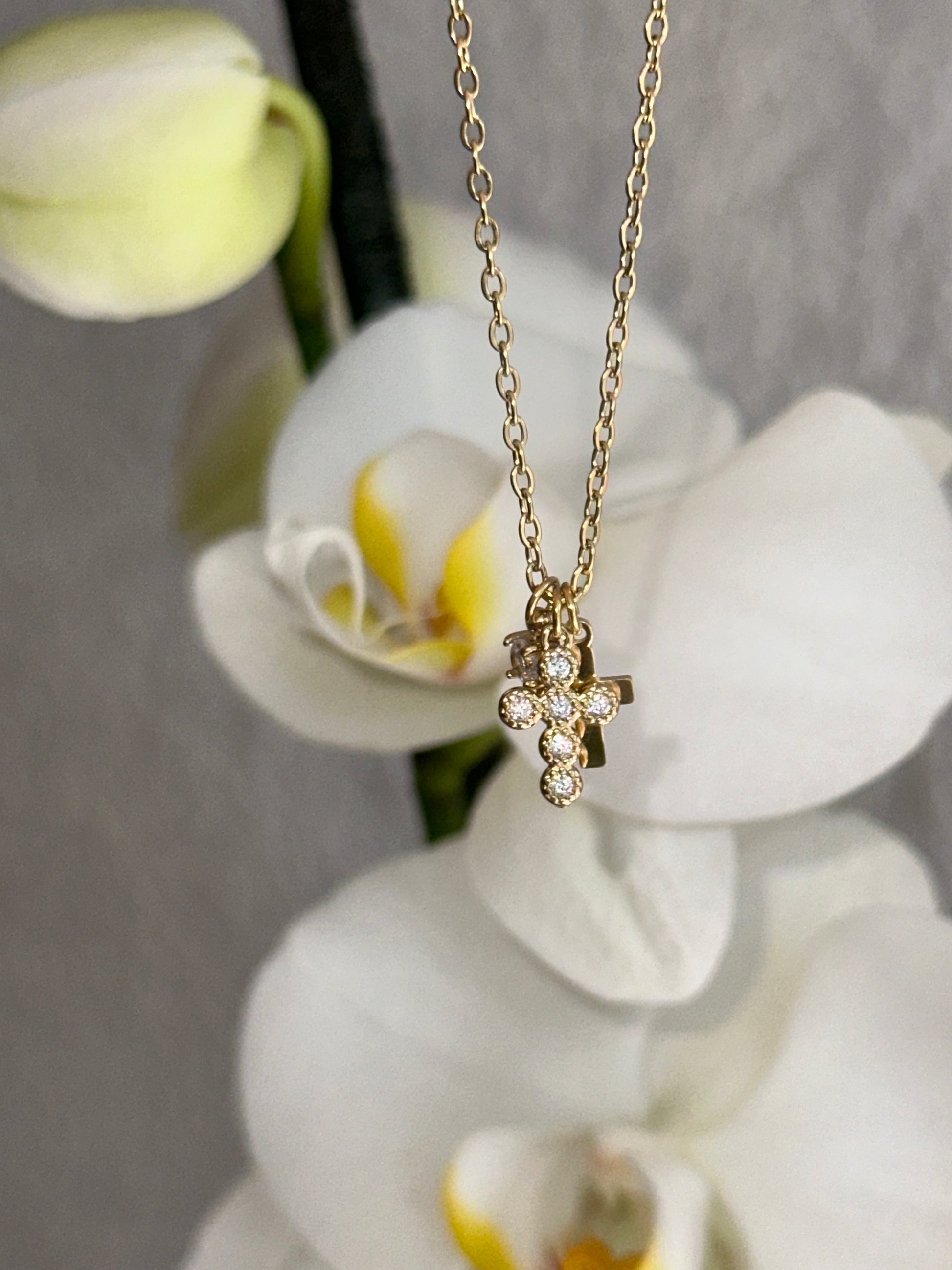 Collar de acero inoxidable con 3 dijes, 2 mini cruz una lisa y la otra con cristales y Un cristalito pequeño.