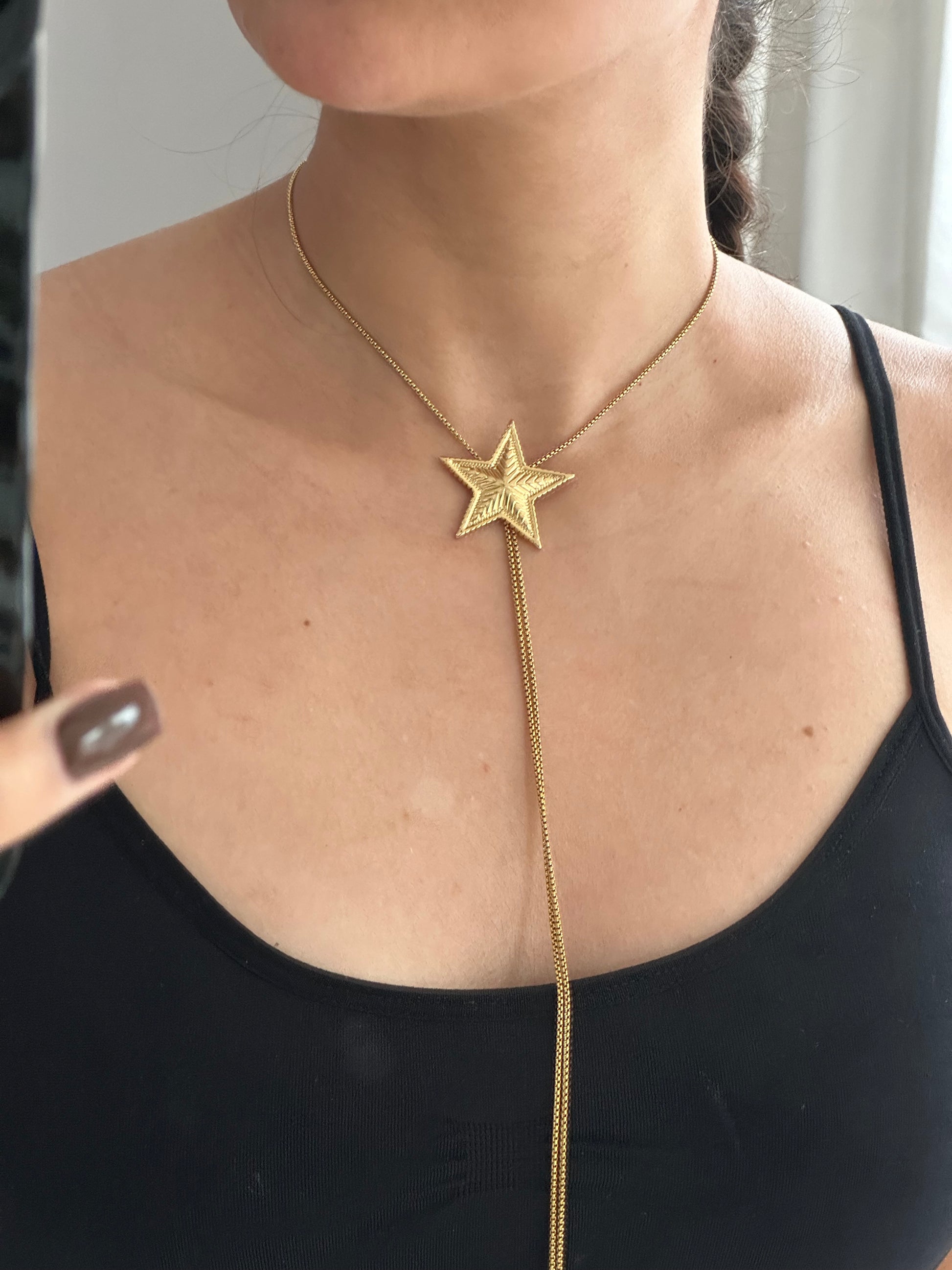 Collar estilo corbatín con estrella, se ajusta al tamaño que deseas. Acero titanio resistente al agua.