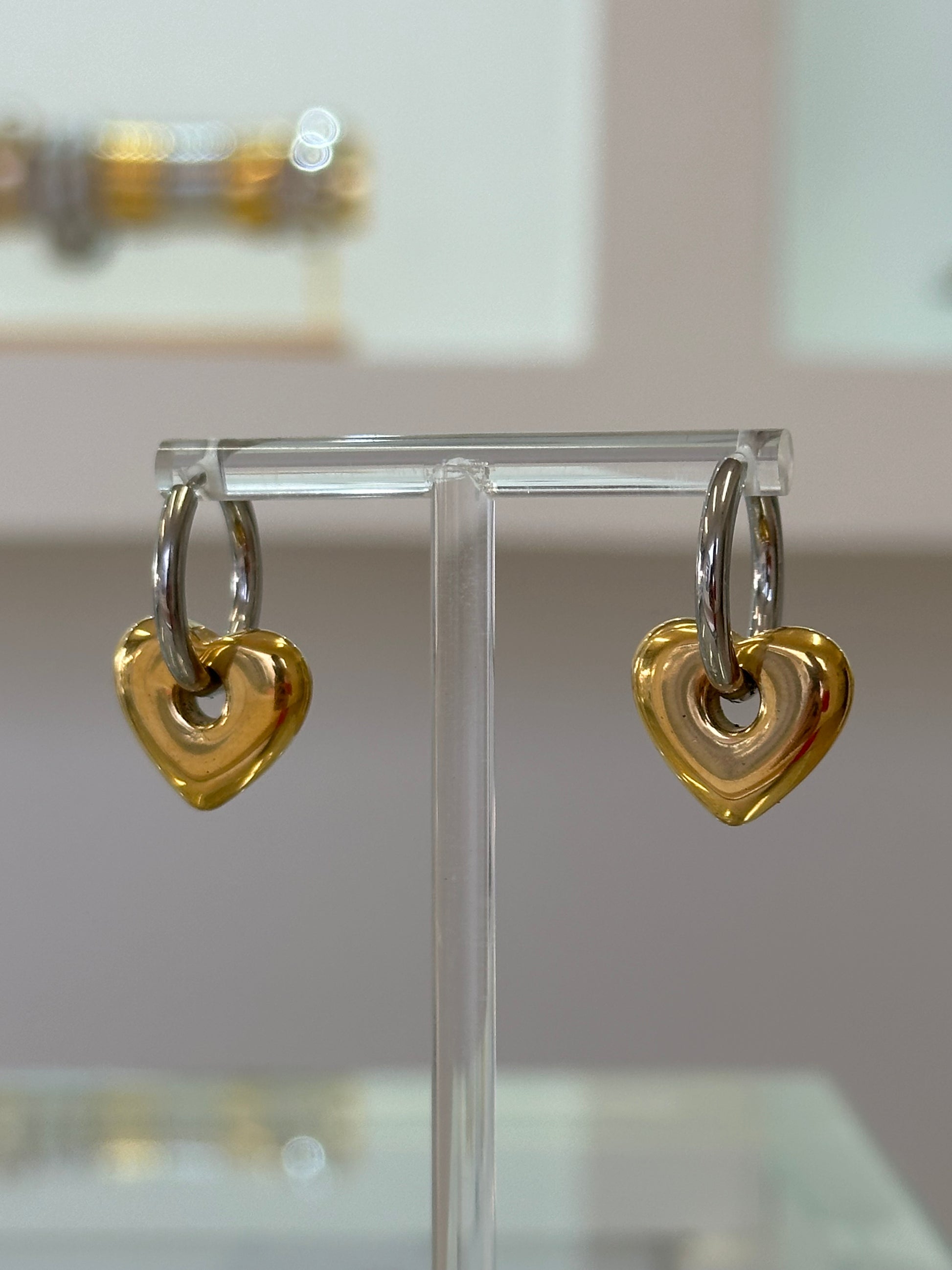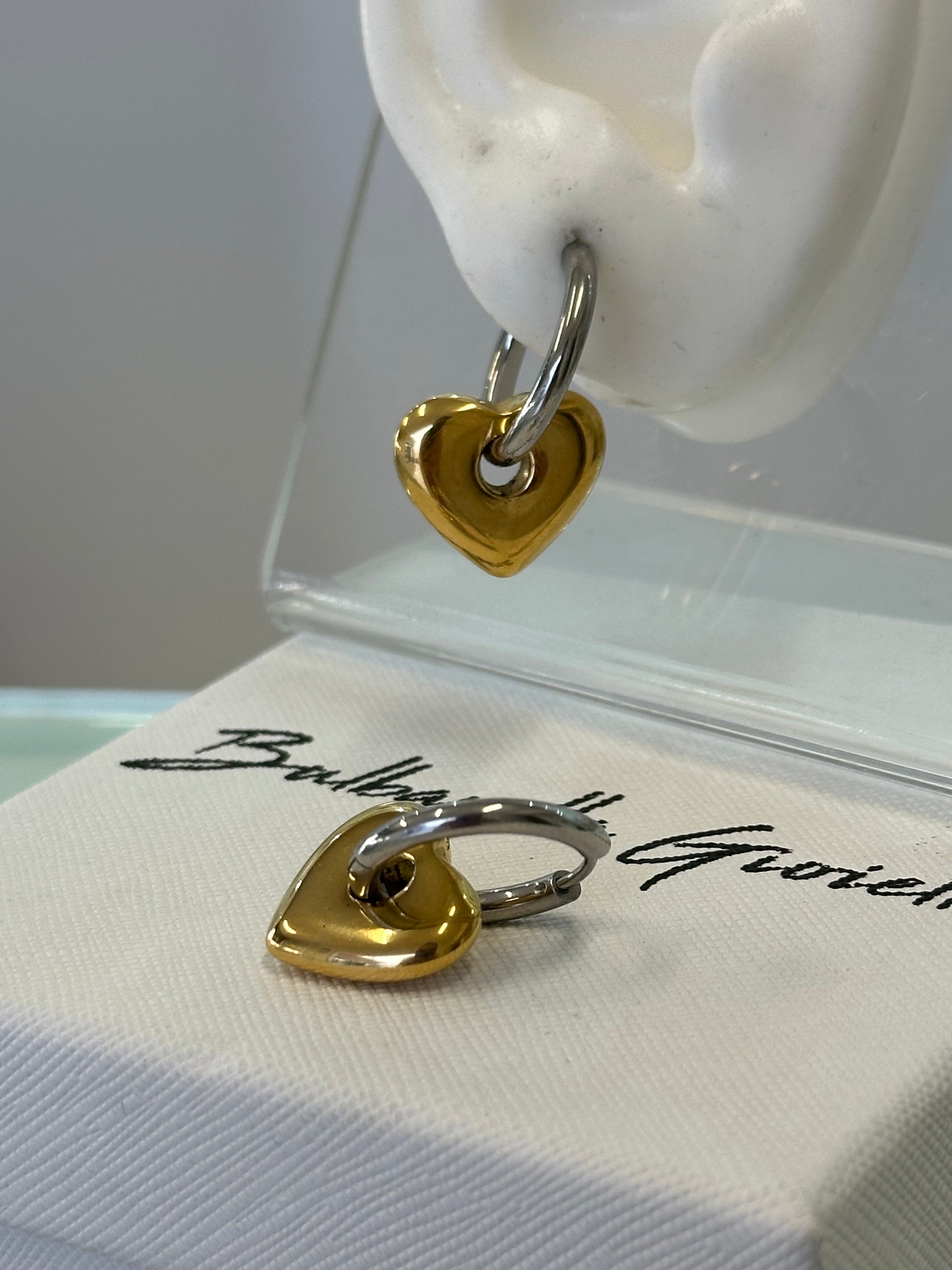 Hoop bitono con dije de corazón, una pieza versátil a la que le puedes sacar mucho provecho usándolas de diferentes maneras, el dije lo puedes usar como cadena y puedes agregar mas charms.