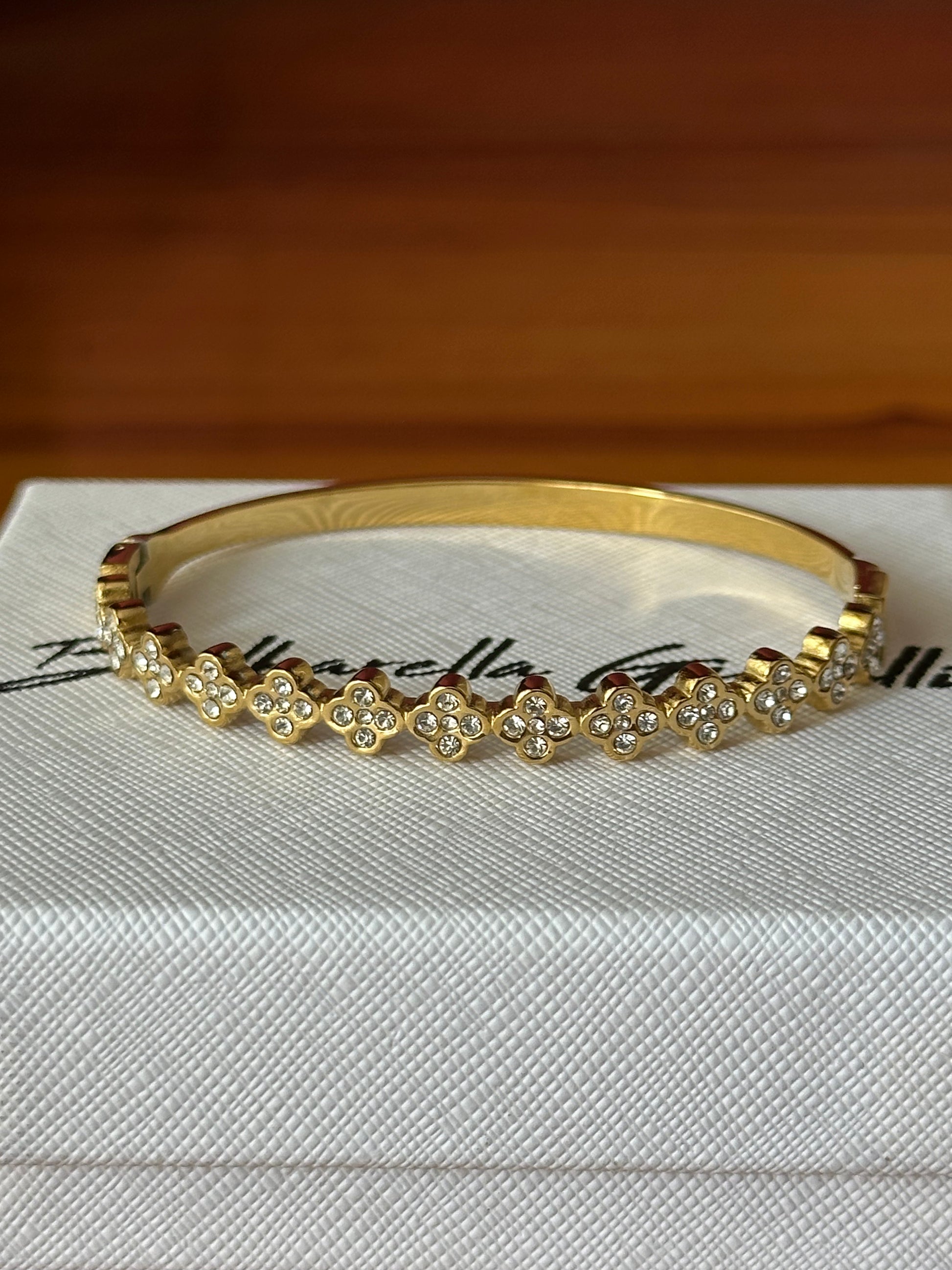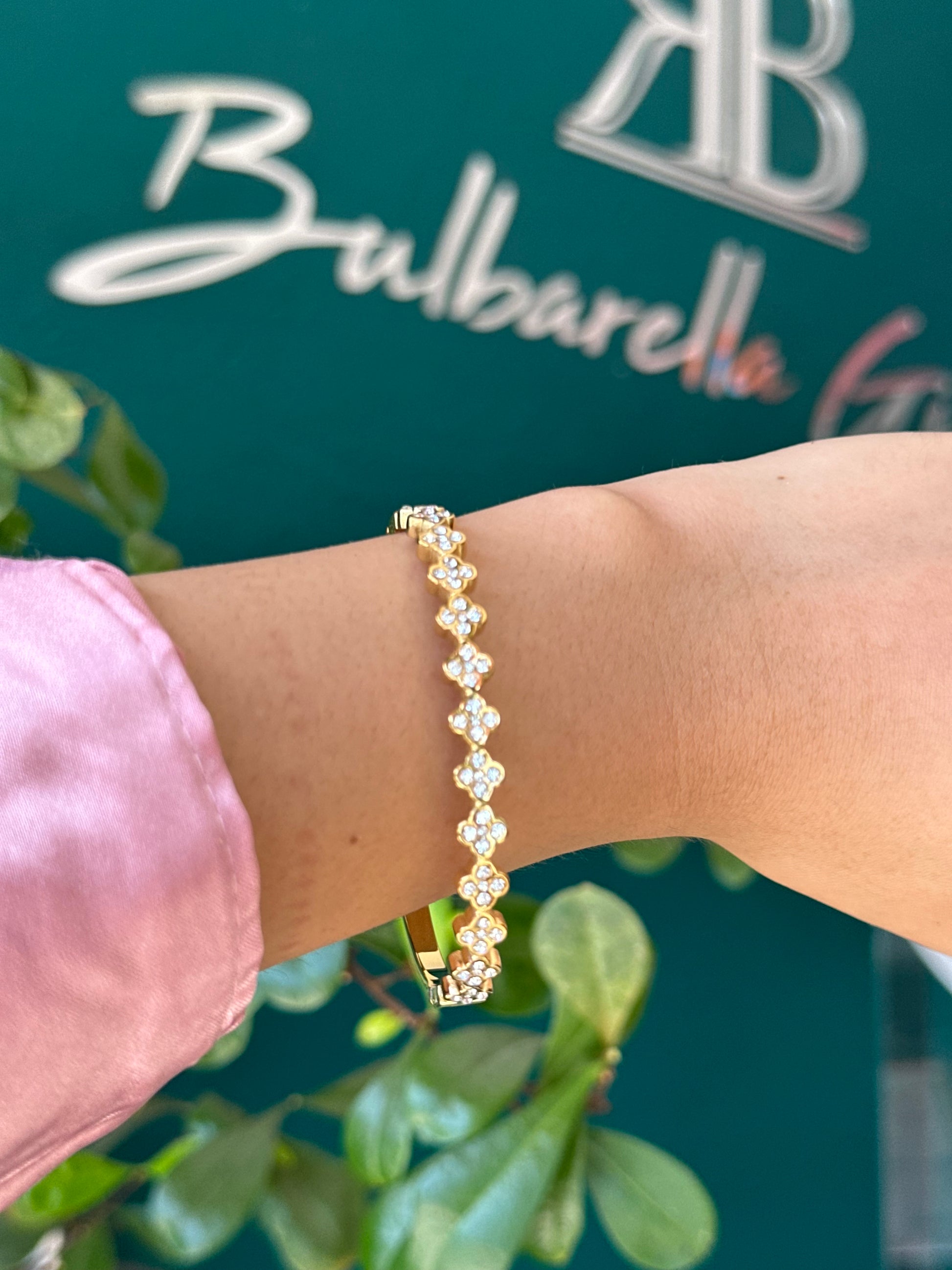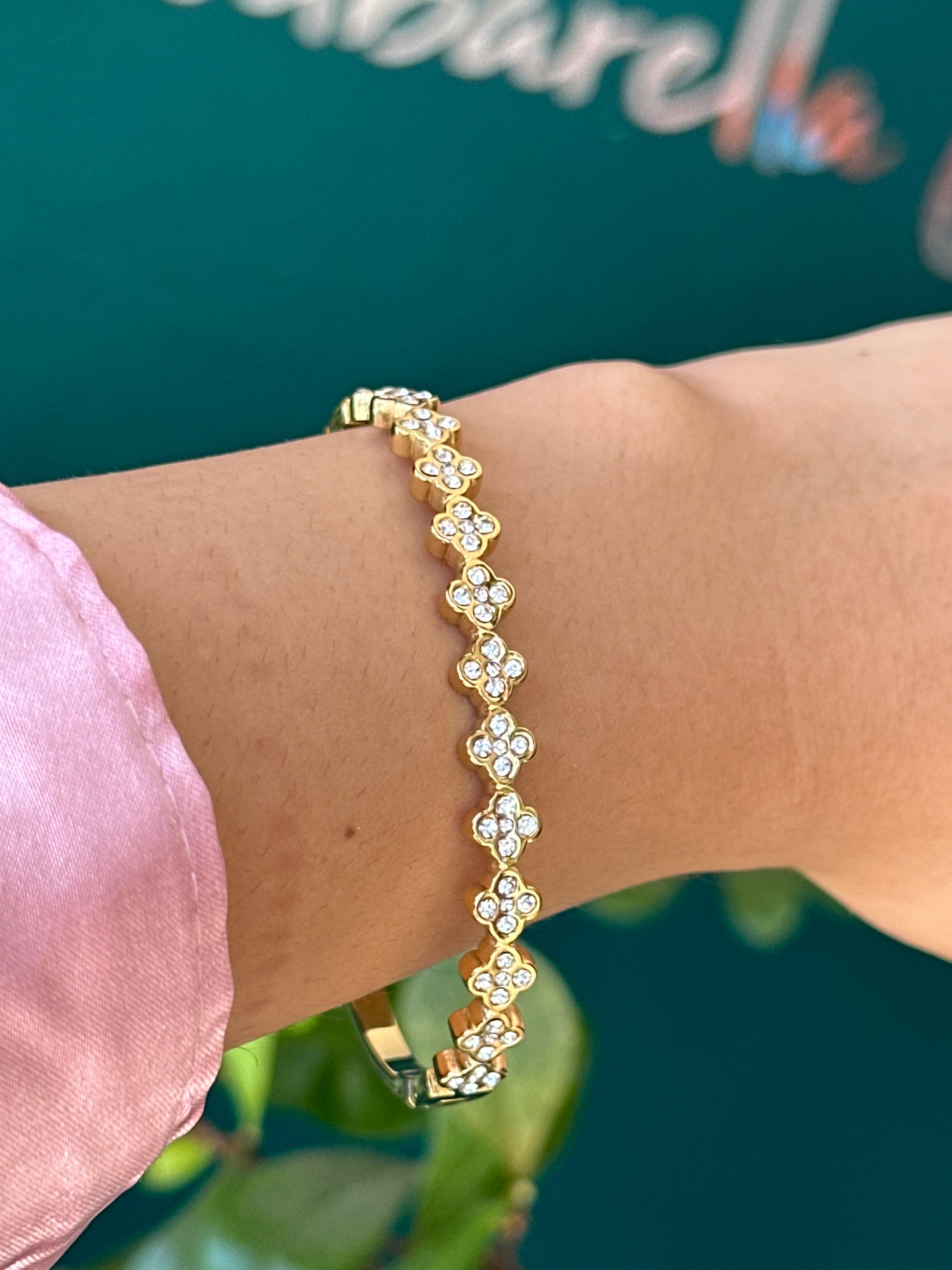 Pulso acero titanio, su diseño de unos trébol con cristales incrustados y la otra parte es lisa.