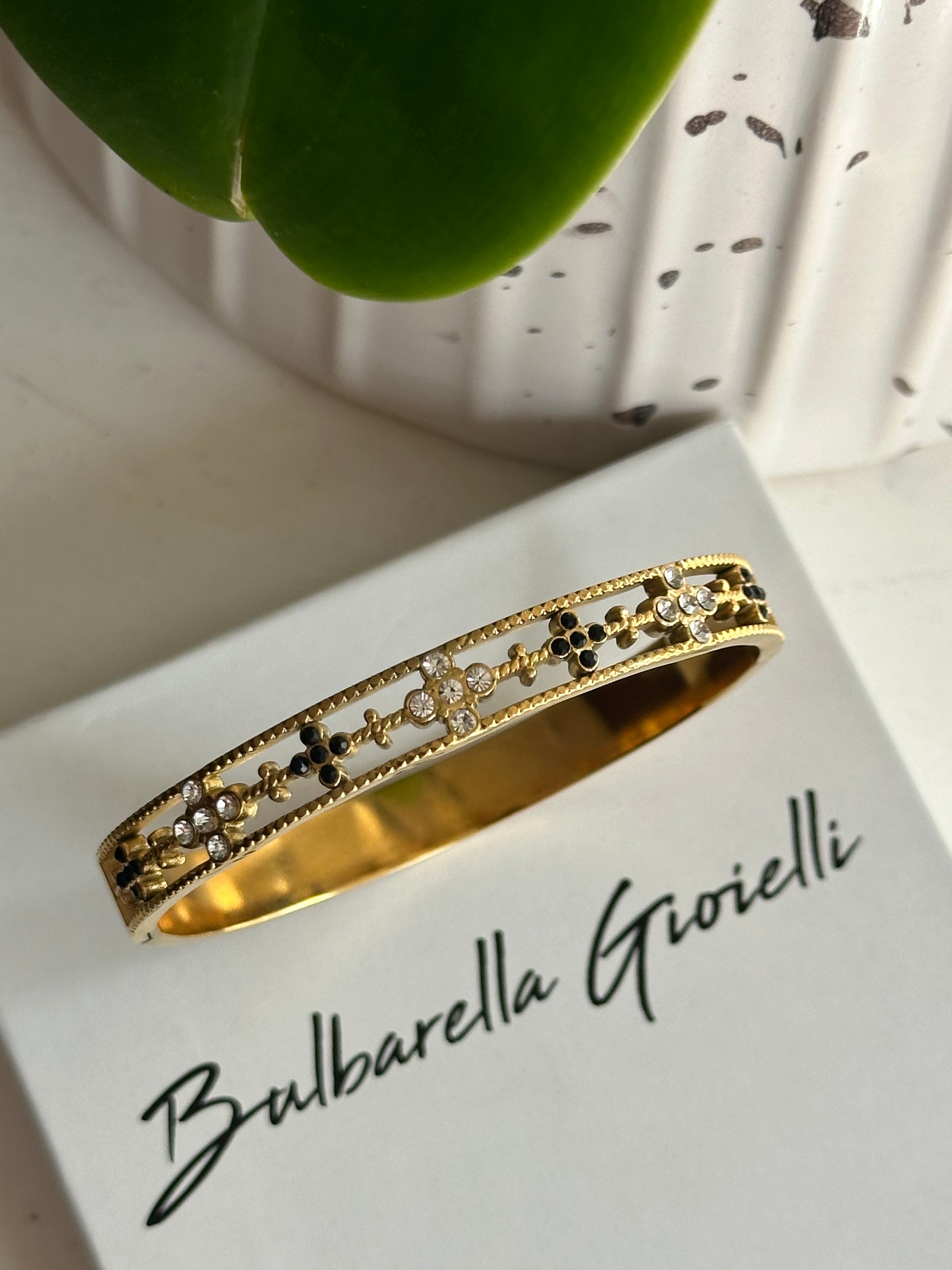 Pulso de acero inoxidable, con diseño en una mitad. crucesitas pequeñas con cristales blancos y negros.