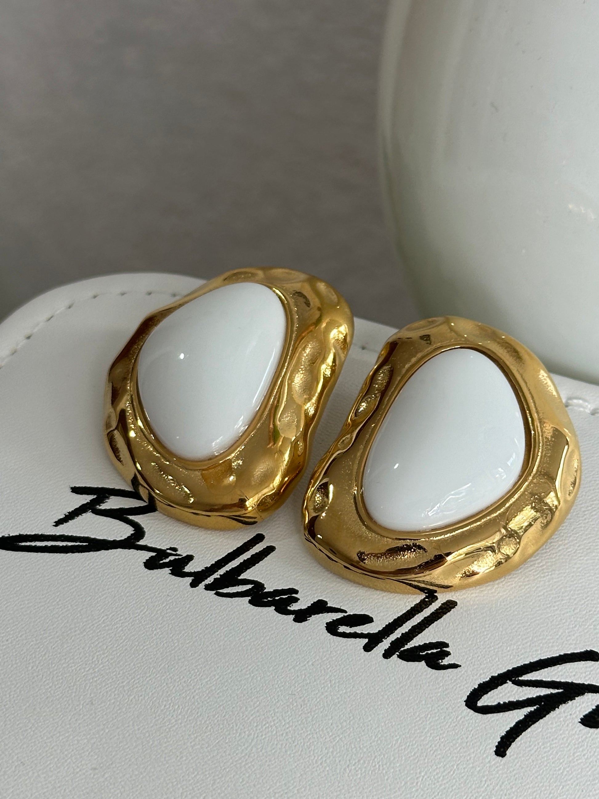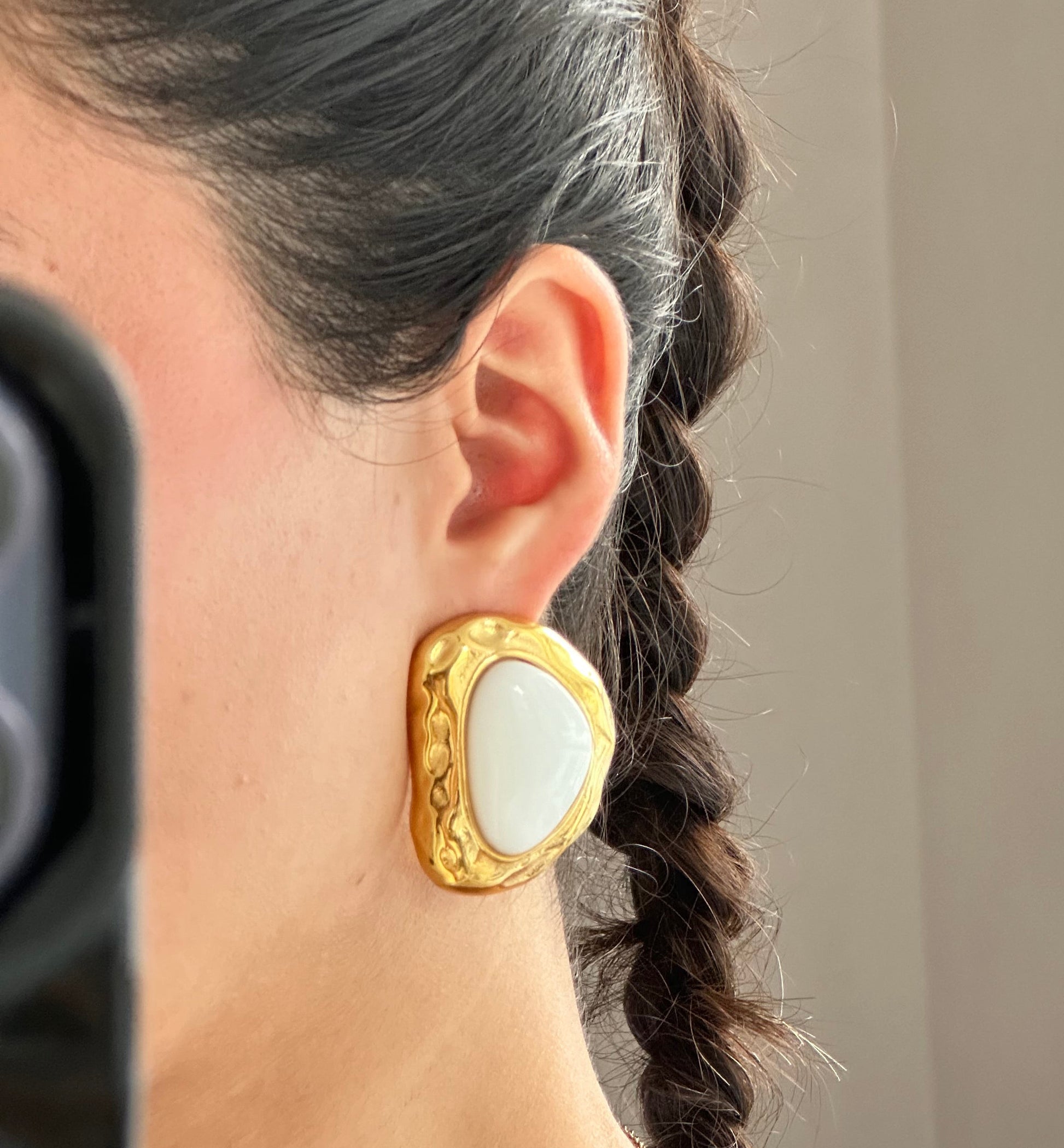 Maxi arete statement de diseño irregular con piedra blanca en el centro. Ideales para elevar cualquier look, chic, elegantes, creativos.